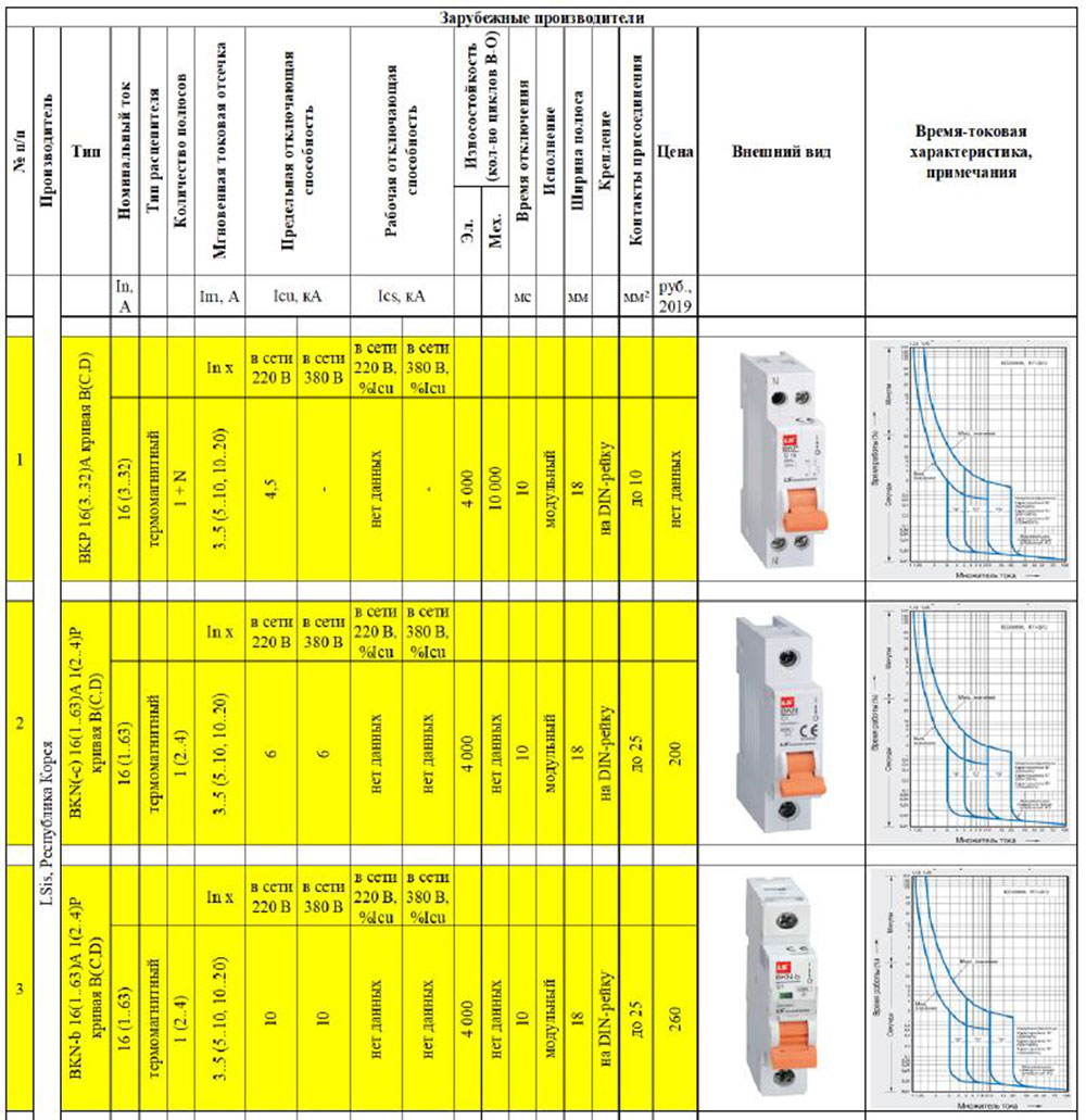 Итак, всю информацию сведём в таблицы. Набор функций и характеристик, указанный в таблицах, представлен в каталогах производителей. Он наиболее полно отражает оценочную картину, а также достаточен для правильного заказа автоматов у поставщиков. В скобках указаны возможные варианты для заказа. Например, если исключить параметры, заключённые в скобки, получим автомат, отвечающий минимальным требованиям. Стоимость указана в рублях, в ценах 2019 года с сайтов крупных поставщиков. Взаимозаменяемые аппараты (с идентичными или схожими характеристиками) выделены одинаковым цветом – для наглядности.